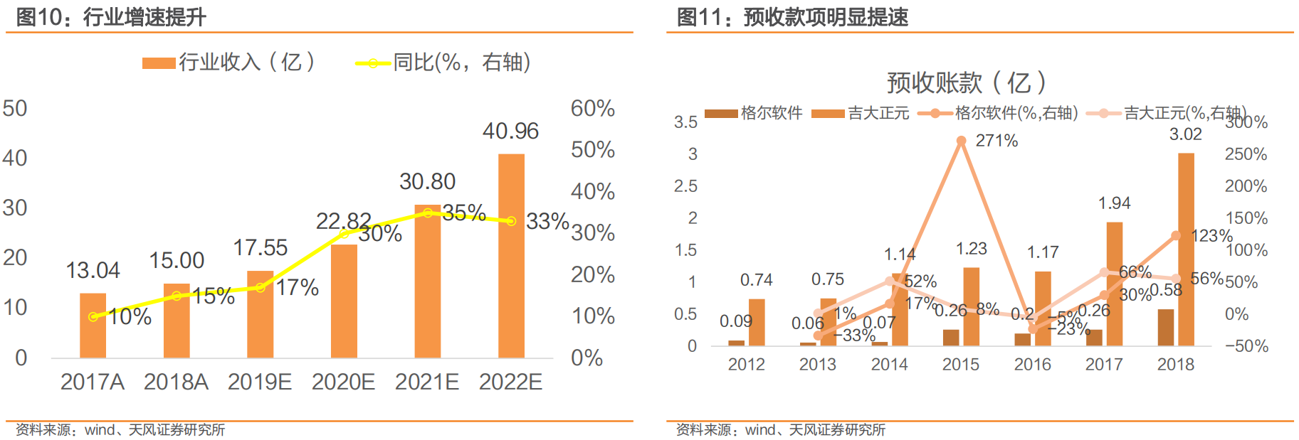 相关上市公司(如格尔、数字)过去十年收入与预收增速稳定在10%~20%之间,但18年下半年开始预收账款层面已有明显提速,只是报表收入端暂未明显体现。
