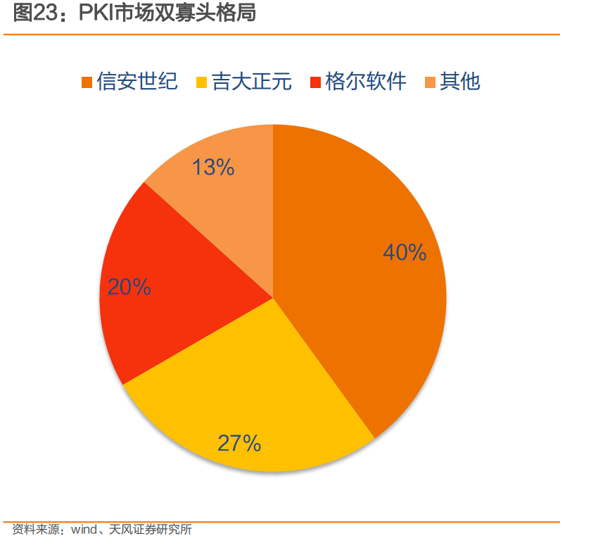 格尔软件先发优势明显,已经占据优质客户资源。而考虑数据互通性,公司在未来PKI密码客户下沉中,我们认为公司优势显著。结合目前国产密码厂商在参与业内标准制定情况、身份和数字认证软件的市占率情况,我们认为,以在国产密码细分行业下PKI领域(非金融),吉大正元和格尔软件的双寡头格局有望延续。