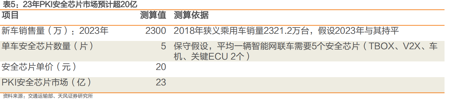 车联网国密标准,2020年有望落地。根据我们的测算,单台车需要约5个安全加密芯片,这有望带来约20亿市场。考虑5G联网进度,预计有望于2022~23年放量。不止于电子签名、物联网,联盟链和数字货币层面加密标准有望出台,银行、联盟链企业需加配PKI。我们认为,银行PKI、联盟链远期市场空间非常值得期待。