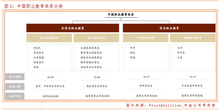 职业教育可以分为两个板块,一方面是学历职业教育,也就是中专、大专、专升本、大学等面向初中和高中毕业生人群;另一方面是非学历职业教育,主要是各项职业技能培训,以及公务员、事业单位、教师等招录考试,或者专业资格考试(例如CPA考试)等。以上两者的终极目标都是为了促进就业。