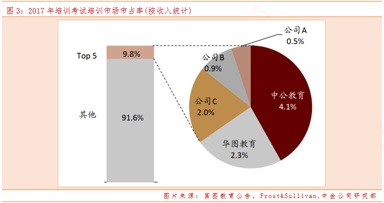根据前瞻产业研究院数据显示,职教培训行业的集中度很低,CR3不足10%,即便是行业龙头—中公教育的市占率也只有4%。本次疫情之下,一季度线下培训全部停摆,职教培训公司受到冲击严重。但是行业龙头和纯线上教育公司却会受益于行业出清而抢占中小机构的市场份额,提升行业集中度。