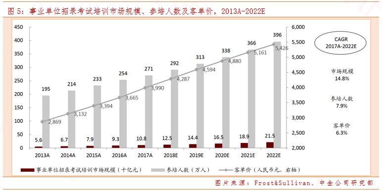 目前全国性人才招录和人格考试的参赔率均不高于30%,从高到低排序依次是考研30%>CPA20-30%>自考10-30%>法考18%>教师资格证15%(笔试30%*面试50%)>国考2%,参考人数的增加和通过率低的矛盾将推升参赔率(报班培训率)与客单价,直接为市场带来增量。以考研为例,根据教育部数据,2020 年全国硕士研究生招生考试报考人数为 341 万人,同比增长 17.6%,创十年新高。预计考研竞争将越发激烈,驱动培训需求增加。再看事业单位,根据Frost & Sullivan 数据,2017 年事业单位招录培训市场规模约108亿元,2022 年市场规模有望翻番,期间年复合增速将达14.8%。而相对应的,参赔率从2013年的24.3%提升至2017年的25.6%,预计2022年将提升至28%,客单价年复合增速6.3%。