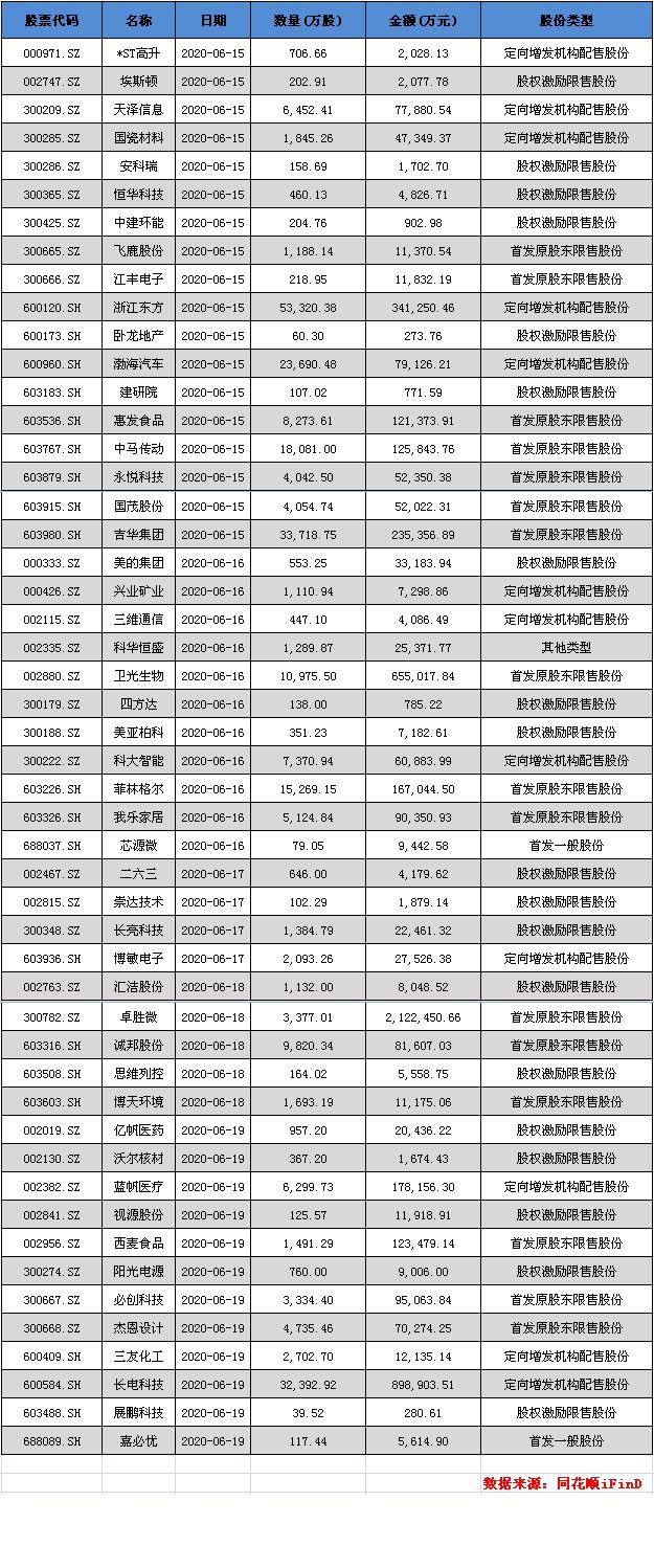 另外尽管惠发食品(603536)解禁数量不大,但惠发食品在2019年末段走势诡异,疑似有资金操作,因此一定程度上都需要关注,惠发食品在6月15日解禁。
