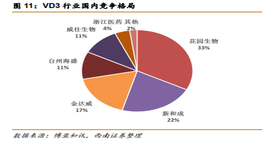 生产上,VD3主要原料是NF级胆固醇。因此,掌握重要原料胆固醇是VD3生产企业的关键。目前国内仅花园生物一家可以生产和销售NF级胆固醇,国内其他VD3企业需要从花园生物采购。投资机会方面,除了花园生物外,新和成是目前国内维生素龙头,VD3产能2000吨;金达威VD3产能1000吨;浙江医药VD3产能800吨。