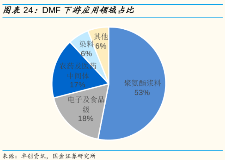DMF是一种有机化合物,为无色透明液体,能和水及大部分有机溶剂互溶。DMF 作为应用 广泛的有机溶剂,在聚氨酯、腈纶、氨纶等化纤产业链应用较为广泛。
