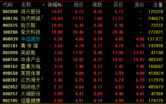 体育板块今日盘中大幅拉升,截至发稿,浔兴股份、当代明诚、哈尔斯、紫天科技等涨停,中信国安涨逾6%。