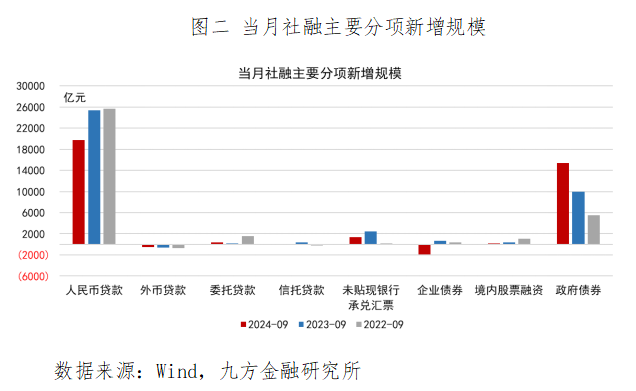 其次,新增社融规模同比少增,结构同样偏弱。9月新增社融为37604亿元,较去年同期少增3722亿元。从结构上来看,政府债同比多增5433亿元,对社融继续形成明显支撑。相比之下,表内人民币贷款同比少增5639亿元,信托贷款、未贴现银行承兑汇票、企业债券、境内股票融资等项目同比均少增,指向内生信贷需求仍偏弱