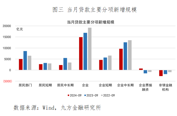 再次,贷款同比持续少增,中长期融资需求明显偏弱。9月新增人民币贷款15900亿元,较去年同期少增了7200亿,但整体水平与2019-2021年相近。其中,居民、企业部门短期、中长期贷款同比均少增,而企业票据融资继续多增,反映出贷款内部结构同样偏弱。其中,居民中长期贷款新增2300亿,回落至2015年以前同期水平,而企业中长期贷款表现同样不佳。种种迹象表明,当前实体经济融资意愿仍然偏低。
