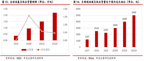 根据高工锂电预算,2022年硅基负极材料需求量为2.2万吨,2019~2022CAGR达80%,预计行业平均毛利率40%以上。按照12万元/吨价格计算,2022年硅基负极材料市场空间近25亿元,市场空间广阔。