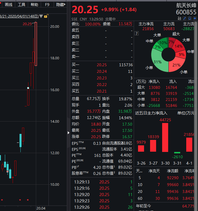 3月20日,航天长峰开启第一个涨停,截至今日,该股9天6板,股价几近翻倍。近期两融交易显著放大,后市应谨慎追高。