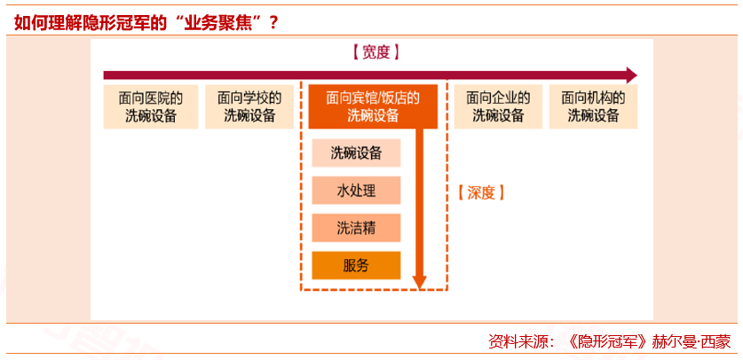 我们以《隐形冠军》一书中的温特霍尔特餐饮服务公司为例试图具体说明何为“业务聚焦:该公司是一家商用洗碗设备制造公司,其所在的“一米宽的市场”即为商用洗碗机市场,面向包括医院、学校、宾馆/饭店、企业、机构等,满足各类场景对商用洗碗机的不同需求。其中,公司在面向以宾馆/饭店为主的餐饮业商用洗碗机领域深耕,除洗碗机以外更推出了自研水处理系统、自有品牌洗洁精、24小时客户服务,此为“做到一百米深”。