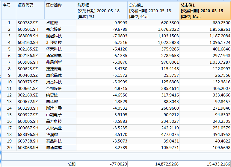 在此消息影响下,苹果概念集体大跌,A股市场上朝阳科技、蓝思科技、赛腾股份等20多只个股跌幅超过5%;港股市场也未能幸免,舜宇光学科技重挫11.35%,丘钛科技大跌近10%,瑞声科技跌超6%。早盘一度冲高大涨逾8%的中芯国际,很快就开始跳水,午后跌幅进一步扩大,收盘大跌6.58%,单日振幅超15%。A股芯片概念也惨遭重挫,华西股份、卓胜微等个股跌停,中科创达、韦尔股份、深科技等20多只个股跌超5%。华为概念则普遍重挫,天和防务、风华高科等多只个股跌停。其中,韦尔股份市值缩水近180亿元居首,该股是目前A股芯片概念市值龙头,曾一度超1900亿元;立讯精密和舜宇光学科技市值缩水均超过百亿元。海康威视、闻泰科技、澜起科技、蓝思科技等个股市值缩水均超过80亿元,汇顶科技、卓胜微、深南电路等多只个股市值缩水超50亿元。