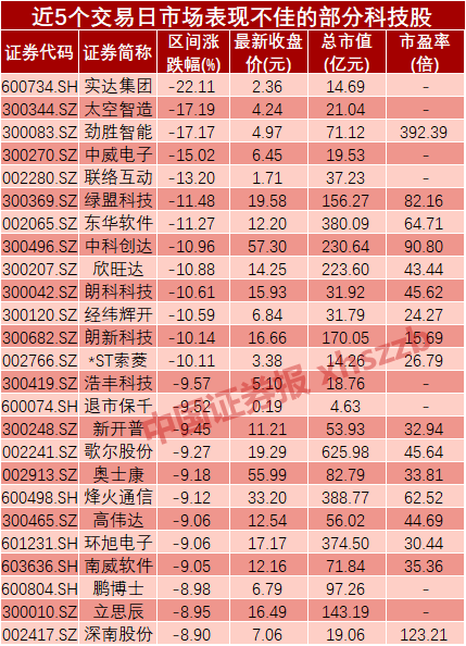 值得一提的是,15只科技股不仅回吐了年内所有涨幅,且在近5个交易日内,股价先后创出了年内新低。
