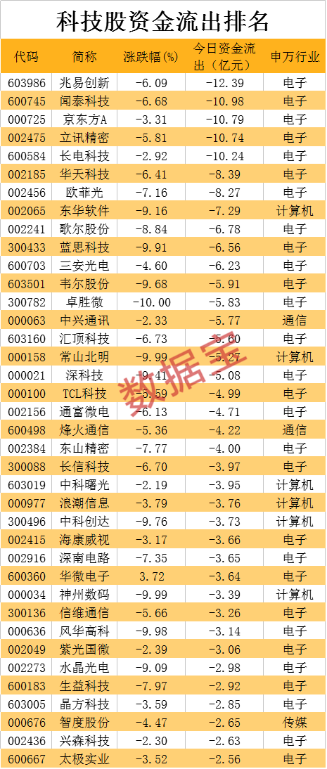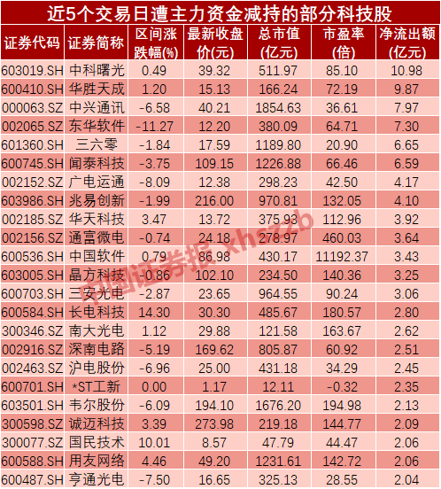 中科曙光、华胜天成、中兴通讯、东华软件、三六零、闻泰科技排名靠前,净流出额分别为10.98、9.87、7.97、7.30、6.65、6.59亿元;广电运通、兆易创新、华天科技、通富微电、中国软件、晶方科技和三安光电同样遭主力资金大幅减持,净流出额均在3亿元以上。