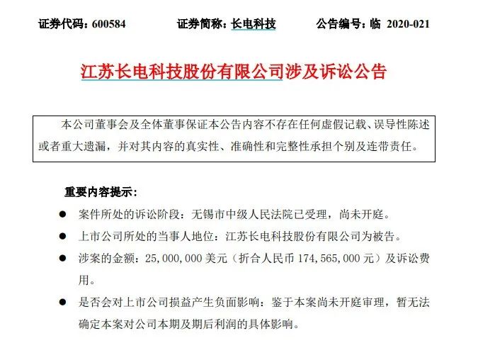 然而,就在长电科技刚刚涨停之后,4月30日晚上,该公司突然发布公告称,遇上了官司。