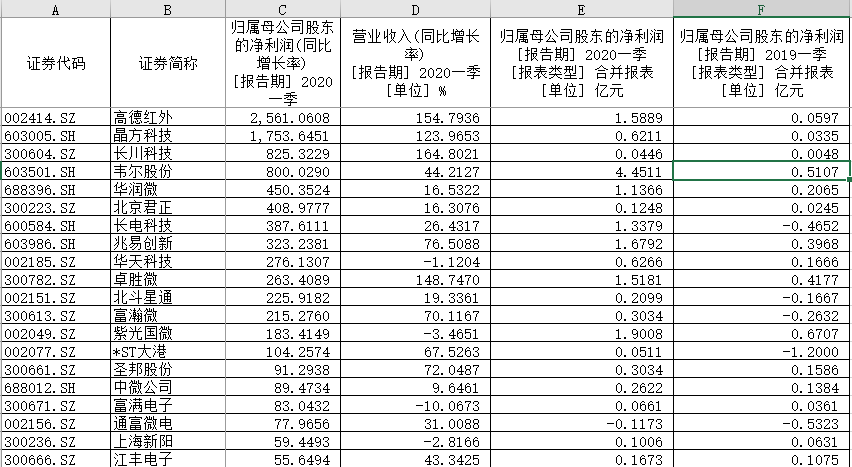 从业绩的情况来看,芯片公司的业绩多少是超出市场预期的。来自WIND的数据显示,芯片行业2019年一季度净利为28.27亿元,而2020年一季度净利是达28.57亿元。虽然增幅不大,但考虑到疫情这个特殊情况,芯片行业整体能够录得增长已属不易。从个股来看,一季度业绩增速翻倍的企业更是高达14家,高德红外、晶方科技、长川科技、韦尔股份、华润微、北京君正、长电科技、兆易创新业绩涨幅巨大。