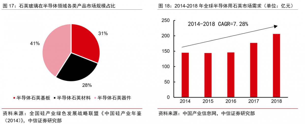 近年来全球半导体销售额与半导体设备销售额均在高速增长。数据显示2018年全球半导体销售额达到4690亿美元,2015-2018年CAGR为12%。石英玻璃在半导体制造关键环节发挥重要作用,带动半导体用石英市场需求增长。根据中国产业信息网数据,2018年全球半导体用石英市场需求为206亿元,2014-2018年CAGR为7.28%。
