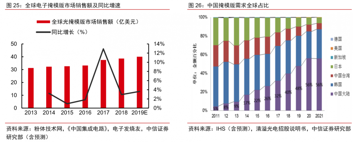石英是制造掩模基板的优良材料。全球掩模版行业增长与中国掩模版需求占比提高,带动石英需求增长。预计2019年全球电子掩模版市场销售额将突破40亿美元。根据IHS数据,中国掩模版需求全球占比从2011年的5%增长到2018年的40%,预计2021年将达到56%。