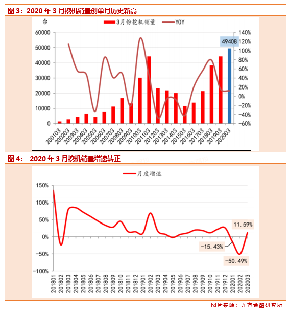 消息面上,3月份挖机销量大超预期,混凝土机挖机接连涨价,创单月销量新高。2020年3月挖机销量49408台,同比增长11.6%,大超预期,其中国内46610台,同比增长11.2%;出口2798台,同比增长17.7%。