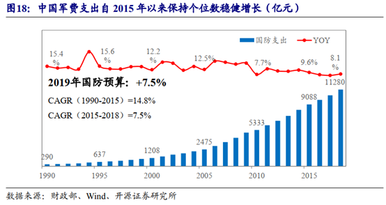 “十三五“以来,2016-2019年我国国防预算分别同比增长7.6%/7%/8.1%/7.5%,伴随复工以后的加班赶工,二季度起绝大部分军工企业营收及业绩将恢复增长。横向比较其他制造业,军工行业下游客户军方需求确定性更高、产业链相对封闭,受经济环境影响相对较小,全年业绩确定性较高。预计2020年我国国防预算仍将保持约7~8%的稳健增长。