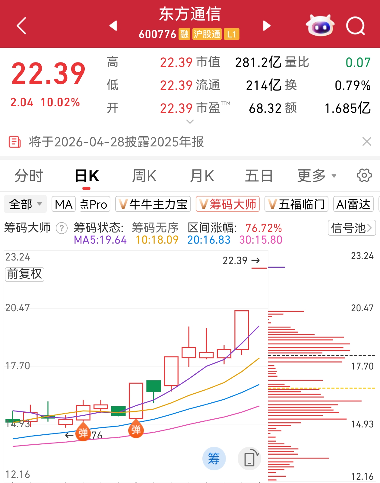 小九注:8天4板!东方通信12月30日发出“弹”信号,预警短线机会,之后强势拉升,走出8天4板,股价从15元飙升到了22元!
