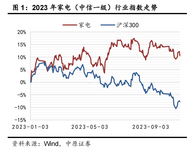 但是,客观不利因素出清,内销回稳与出口提振环境下,2023年家电行业实现转涨。截至2023年10月末,行业全年累计上涨约11%,显著跑赢同期沪深300指数近20pct。