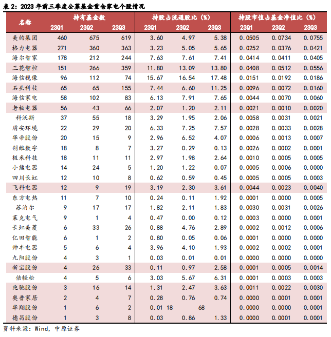 此外,佛山照明、得邦照明等照明板块头部,亦在23Q3受到机构资金加持;机构持仓小家电板块个股中,仅飞科电器持仓规模相对明显,23Q3末重仓基金数增至19支,持有流通股占比升至3.61%。