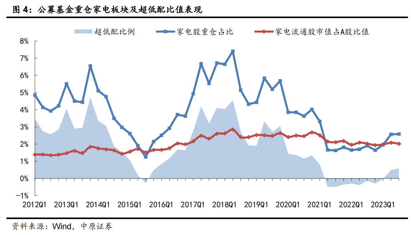 此外,对比行业流通A股市值占比,公募基金对家电行业超配比已连续3个季度提升,达到0.57%。