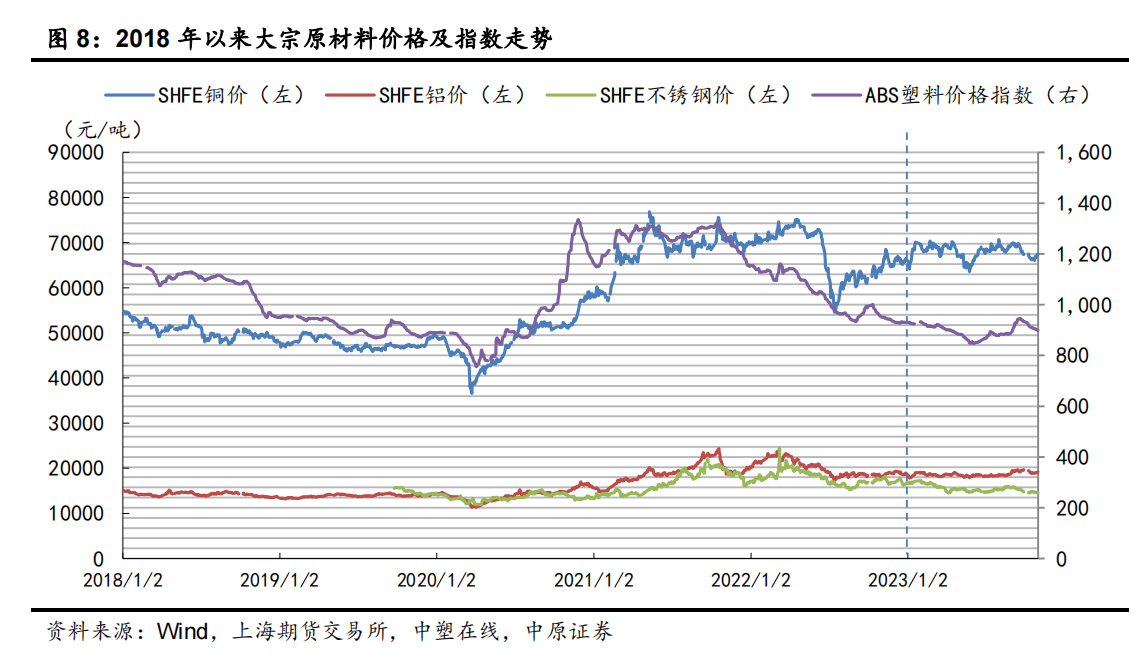根据上海期货交易所、中塑在线等数据显示,期间铝、不锈钢价格以及ABS塑料价格指数均值较上年同期分别下降8.6%、13.1%和15.1%,铜价格经历23Q2内显著回落后迅速拉升,相较同期其他原材料走势仅微幅上涨约0.8%。总体成本再度优化,致使行业利润空间进一步提升。