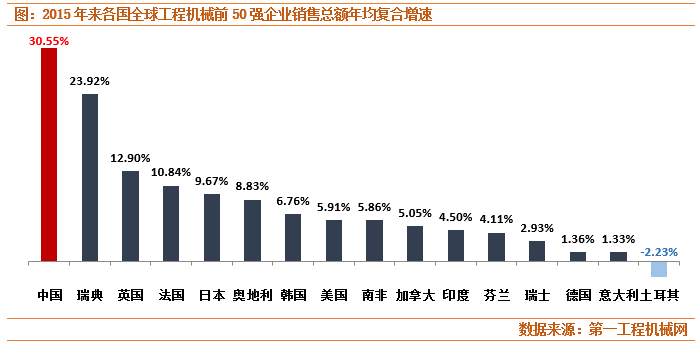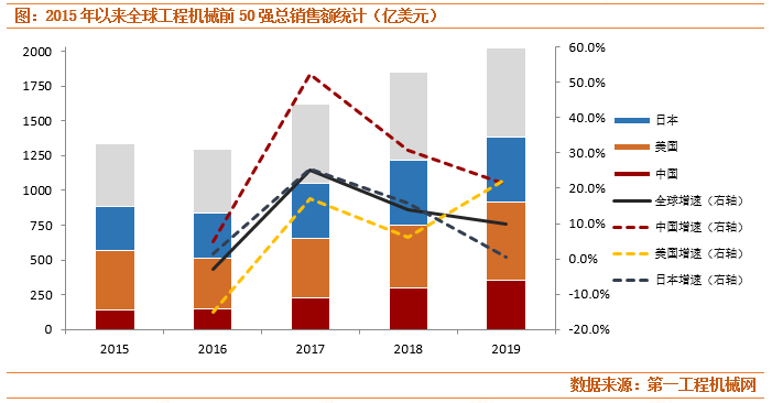 2015年以来,全球工程机械前50强企业的销售总额年均增速为10.40%;在此期间,中国企业的年均增幅傲视群雄。在往年销售额前三的国家里,中国工程机械厂商的总销售额增速一直遥遥领先,仅在2019年略低于美国。
