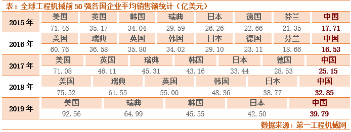 就企业表现而言,中国工程机械龙头们的竞争力快速提升同样亮眼。一方面,中国厂商的营收水平持续赶超提升。数据显示,跻身全球前50强的厂商里,中国企业的平均销售额在2015年仅在全部16个国家中排名第8,业绩水平不及芬兰;而到了2019年,中国企业的平均营收额排名已经升至第5。这期间,中国成功反超了英国、德国与芬兰,与眼下前一位的日本之间的差距也在快速缩小。