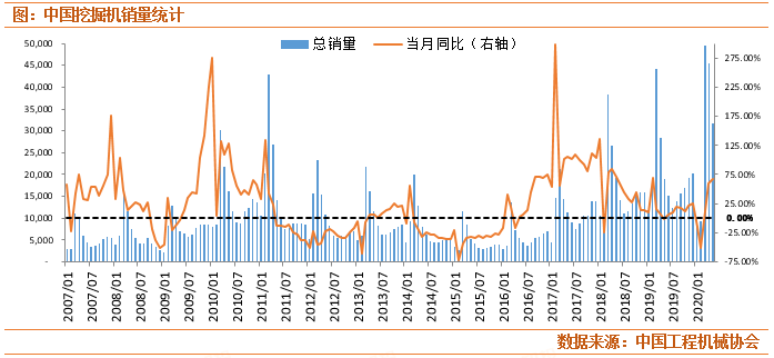 就行业本身来说,工程机械市场持续活跃,行业本轮景气周期似乎并未结束。整体来看,尽管疫情对工程机械市场造成了明显的短期冲击,但销售数据却显示行业近期正在强势复苏,而且复苏强度持续超市场预期。以挖掘机为例,3月以来我国挖掘机销量持续创下历史同期新高,市场增速快速反弹。结合挖机销量数据一直以来明确的时间规律性,年初以来的疫情对于工程机械行业造成的实际影响或更接近于整体需求的递延释放。换言之,眼下工程机械行业整体仍处于景气上行趋势中。