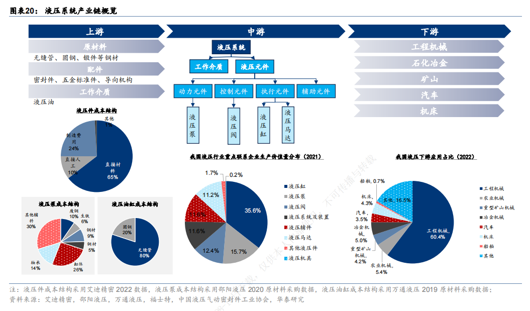 产业链方面,液压系统上游为原材料、液压配件、介质等,原材料成本占比较高,以钢材为主;下游主要应用领域为工程机械,2022年应用占比达60%。在推动电动化以实现节能减排成为制造业发展大势所趋背景下,未来我国液压传动市场规模有望进一步增长。