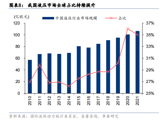目前,全球液压工业已进入成熟发展阶段,我国为全球第一大液压市场,2021年全球市场份额达35%。国内市场规模接近千亿,高端市场具备较大国产替代空间。