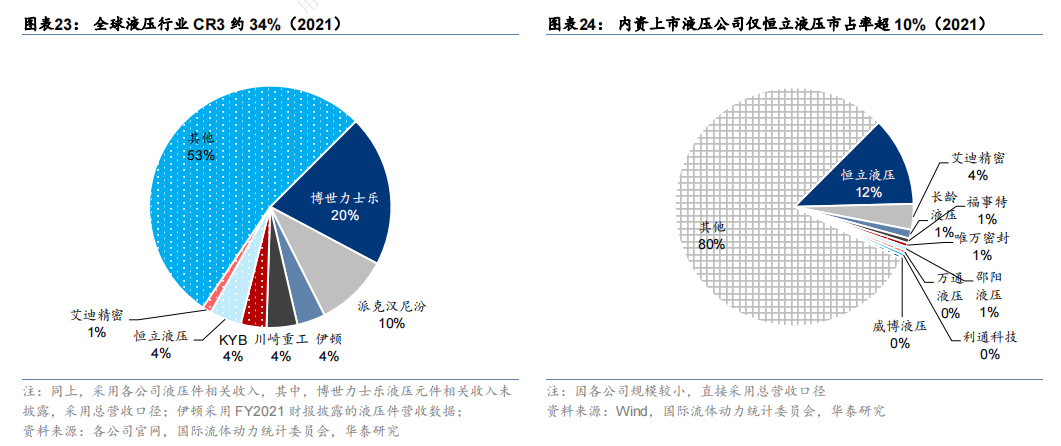 竞争格局上,全球液压市场CR3超30%,集中度较高,龙头公司集中于美、日、欧国家。相较海外龙头,国内龙头产品品类与应用领域还相对单一,市场主要集中于国内,未来在国际市场方面仍有待开拓,渗透率仍具提升空间。