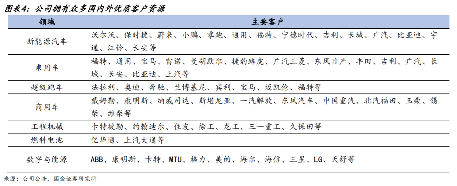 主要客户有:福特、通用、长城汽车、吉利、宁德时代、广汽、上汽、一汽、长安、奇瑞、威马、江淮等。