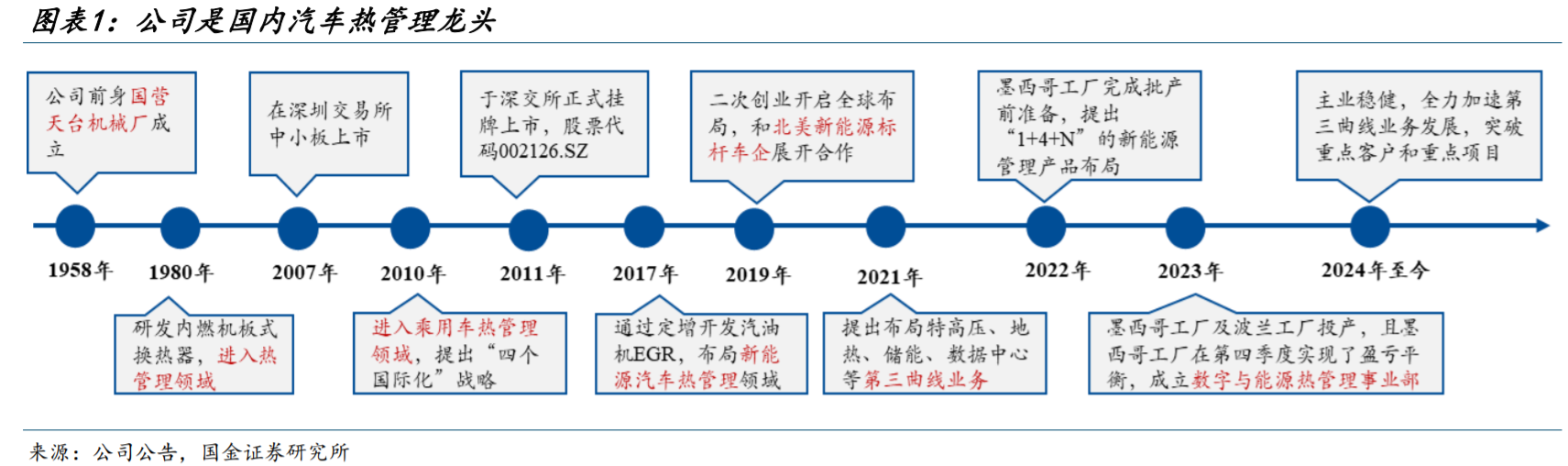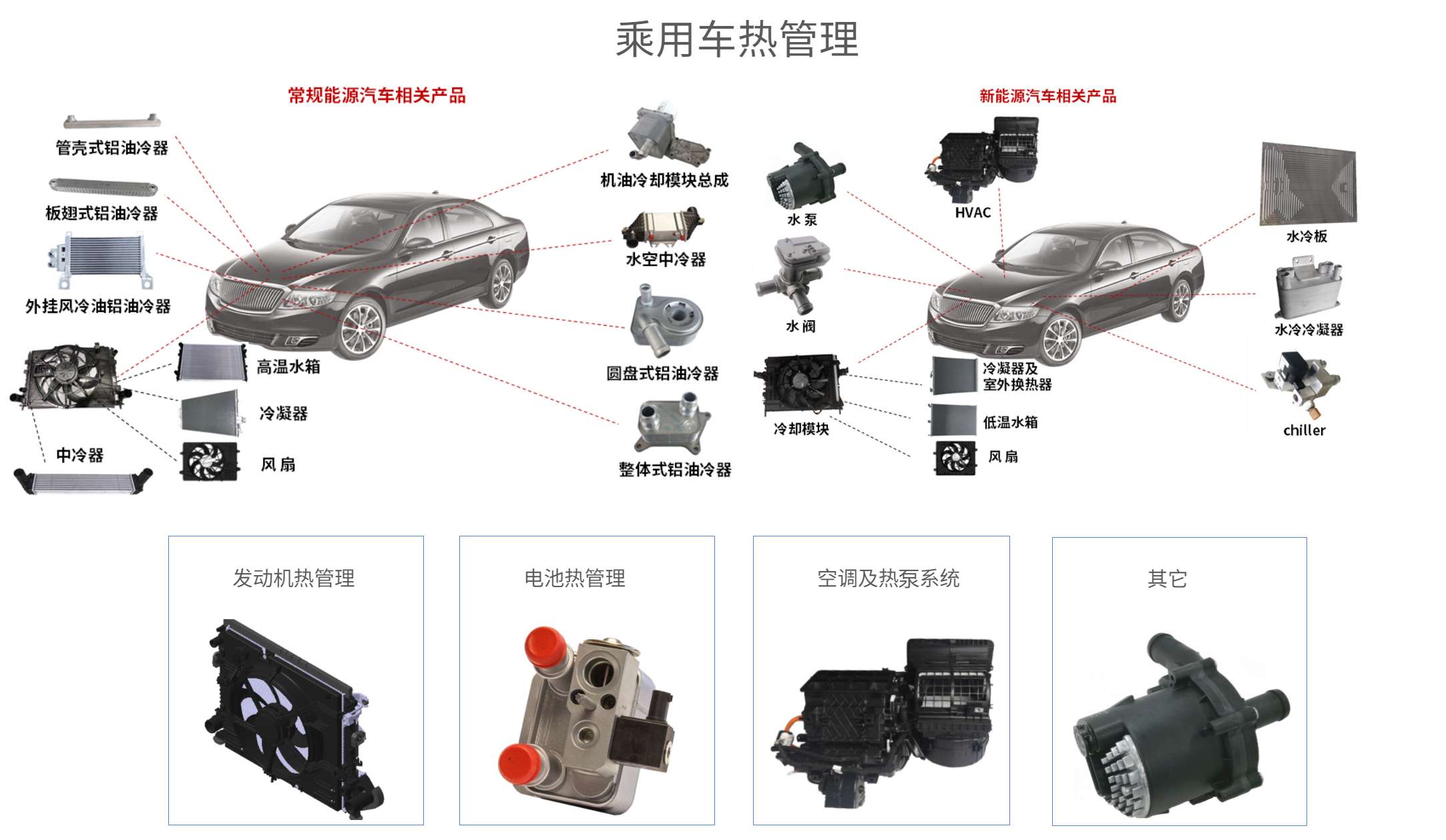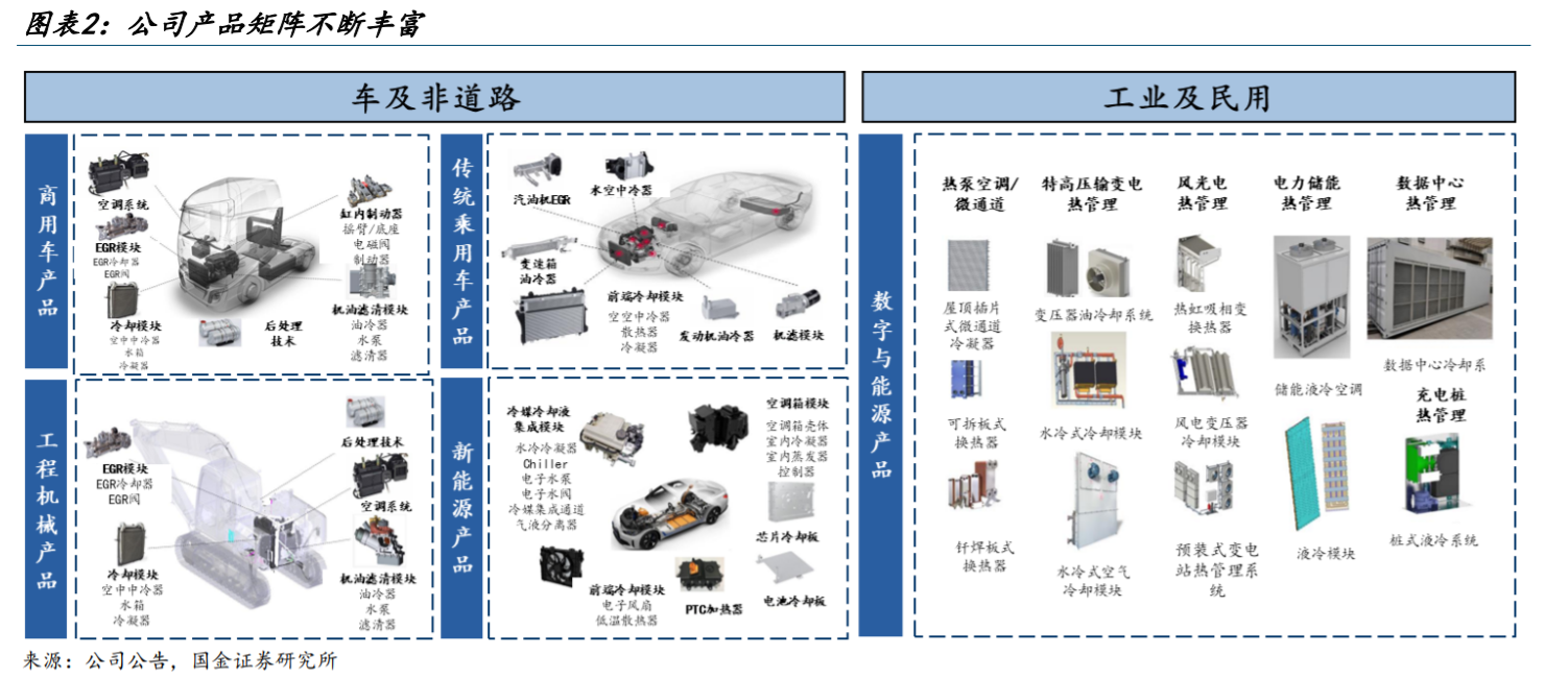 国内汽车热管理龙头,产品矩阵向全应用场景拓展。经40余年的发展,公司成为国内汽车热管理行业的龙头企业。公司凭借内燃机板式换热器的成功研发进入热管理市场,之后逐步迈进乘用车领域,并从车端延伸至数据中心、特高压、储能等第三曲线业务领域。