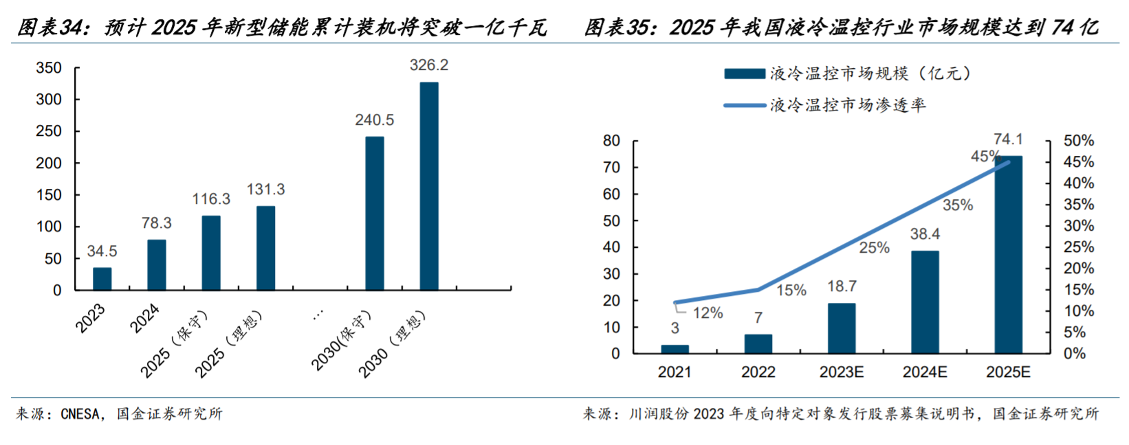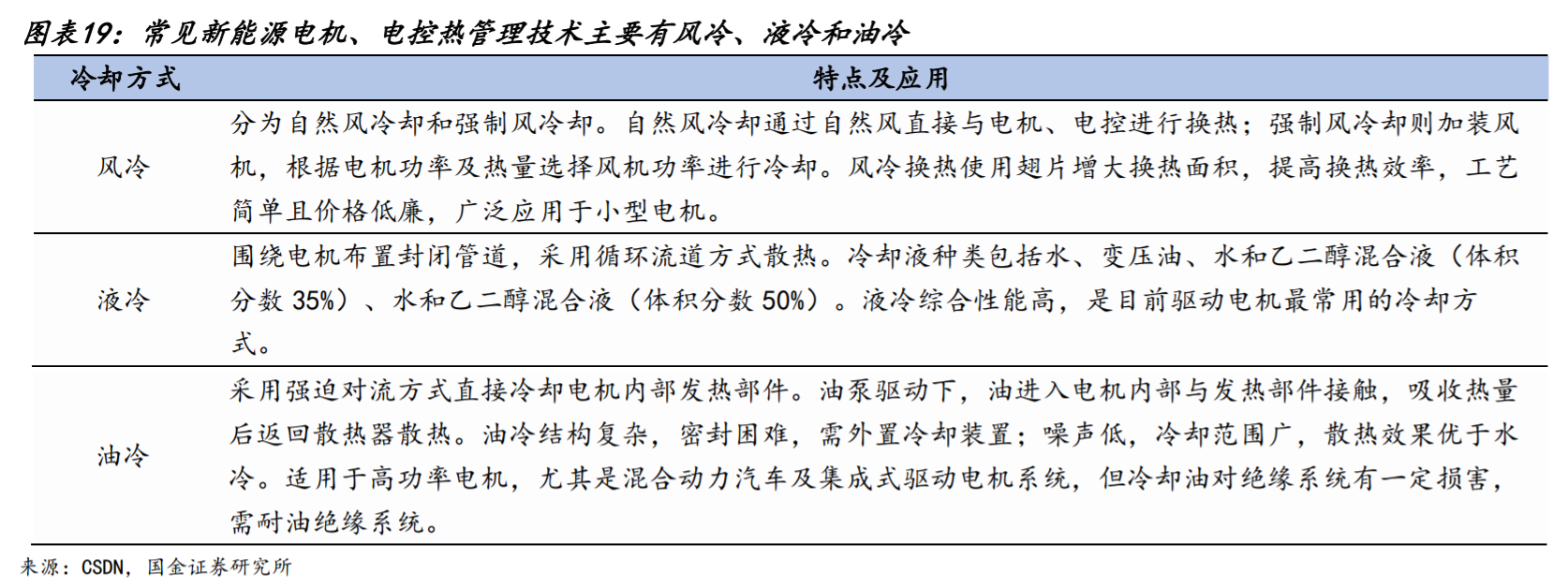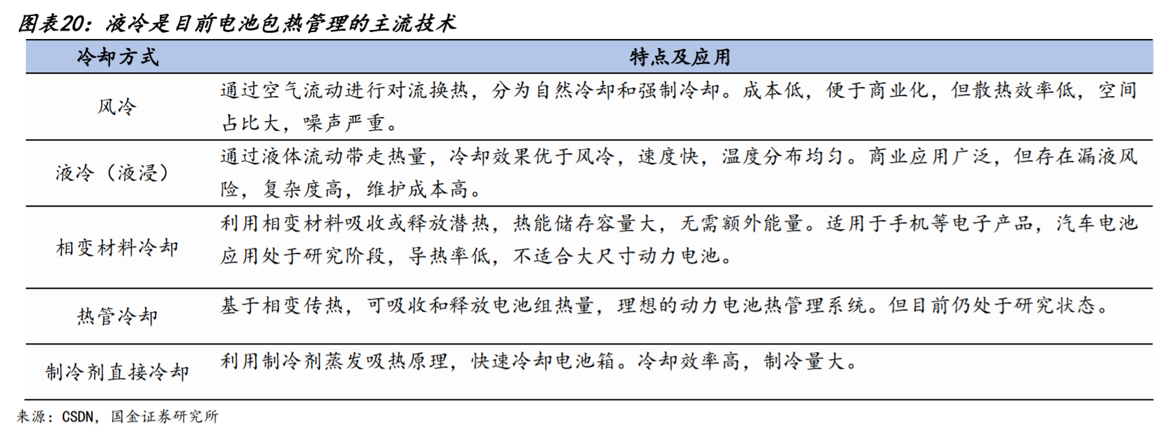 储能:随着风电、光伏装机的快速提升,国内对于储能的需求预期将快速增长。新型储能系统应用的热管理方案有四种:风冷、液冷、热管冷却和相变冷却。其中液冷由于具有低能耗、高散热、低噪声、低TCO(TotalCostofOwnership,总体拥有成本)的优势,液冷温控产品的渗透率逐渐提升。