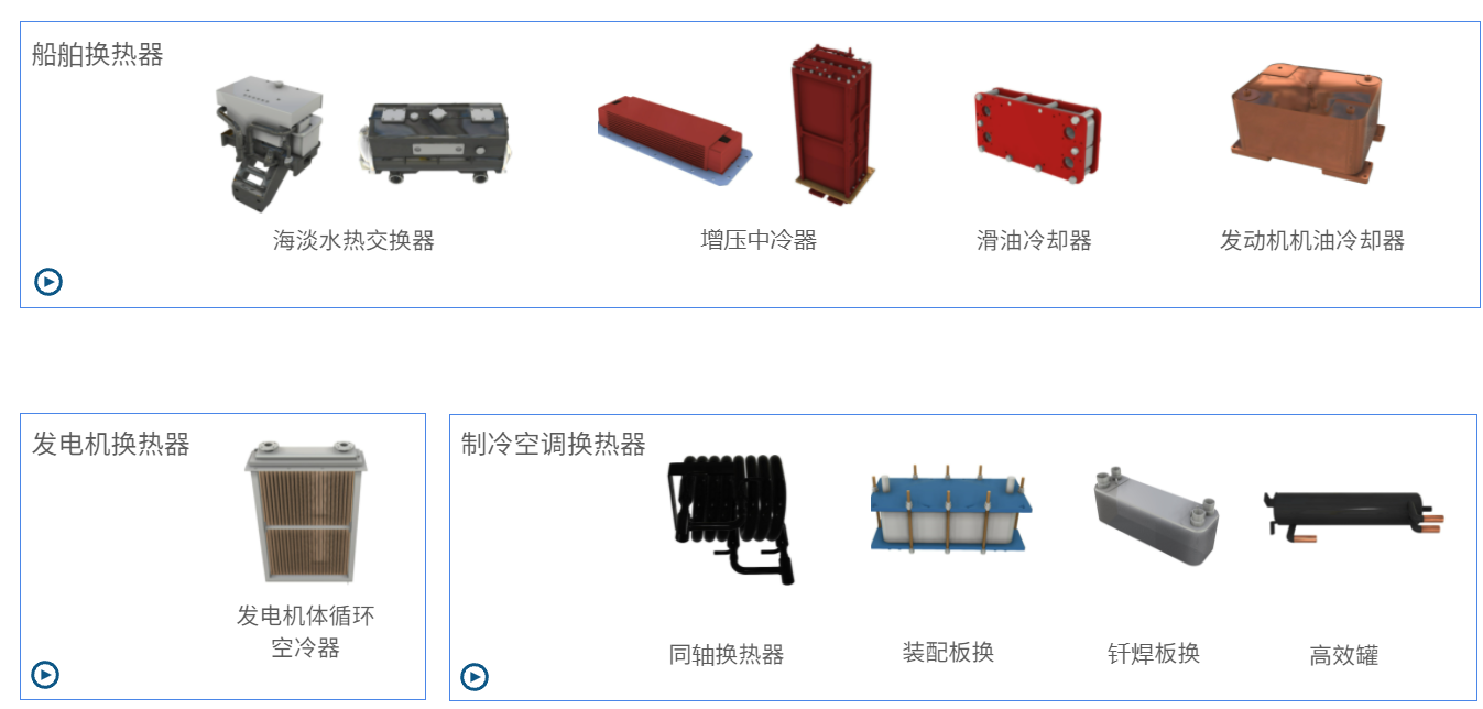 油冷器:应用广泛,主要用于车辆、工程机械、船舶等发动机润滑油或燃油的冷却。产品热侧是润滑油或燃油,冷侧可以是冷却水或空气。