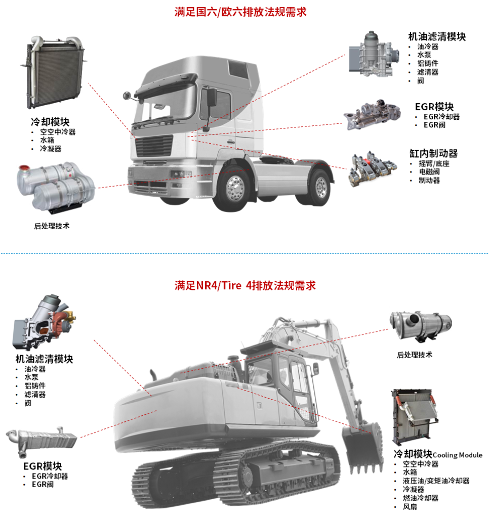 冷却模块:银轮的冷却模块包括冷却风扇、高温散热器、低温散热器、中冷器、油冷器、冷凝器、减震垫、塑料框架等换热元件和附件,根据需求自由匹配。用于冷却车辆动力总成系统、润滑系统、增压进气系统、空调系统以及电池系统,保证上述系统在合适的温度下工作。冷却模块经过优化匹配,能够以最小尺寸获得最高效率,有效降低开发、生产和物流成本。