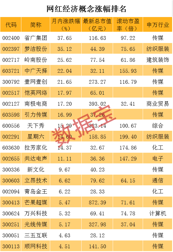 A股网红经济概念也火了一把,大牛股星期六一度在短短一个月时间,股价从7元以下启动,飙升至最高36元以上,最大涨幅超4倍。