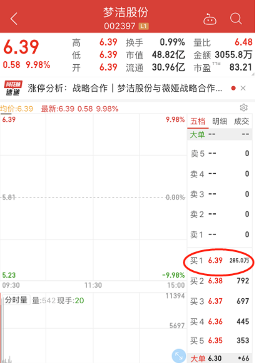 战略合作协议落地,梦洁股份成为A股当之无愧的“薇娅概念股”,就此开启连续涨停之路。截至今天早盘收盘,梦洁股份已经连续3个一字涨停板,市值暴增超12亿元,股价创年内新高。连续涨停后,排队买单依然踊跃,今天早盘封单一度接近3亿股,午间收盘封单仍有1.7亿股。有趣的是,梦洁股份早盘封单金额一度超18亿元,超过其目前流通盘30亿元的一半。