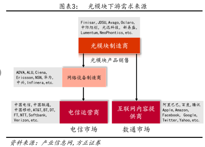 光模块受5G与数据中心双轮驱动。光模块主要有数通市场跟电信市场组成,在电信市场,光模块厂商的主要客户为通信设备制造商,而终端用户为运营商;而数据光模块主要应用场景为数据中心。随5G建设推进及数据中心建设加速,光模块景气度提升。