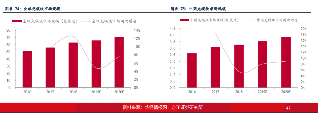全球光模块市场规模保持高增长态势。2020年,全球光模块市场规模预计为71亿美元,同比增长7.58%。预计2025年,全球光模块市场规模将增至177亿美元,较2020年年复合增长率为20.04%。中国市场增速加快。2020年,中国光模块市场规 模预计为26.8亿美元,同比增长8.94%,增长速度高于全球平均水平。
