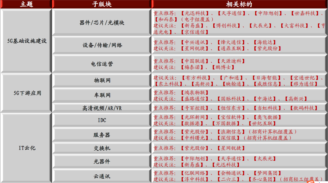 4、光通信:重点推荐中天科技(海缆+特高压拉动业绩反转)、中际旭创(全球数通光模块龙头,5G 重要突破)、新易盛、天孚通信(上游器件龙头)、光迅科技(全产业链龙头,高端芯片有望自主化);建议关注:亨通光电、太辰光、剑桥科技、博创科技、仕佳光子等