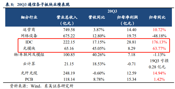 3)光模块、数据中心(IDC)等细分板块景气度持续上行