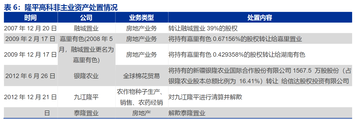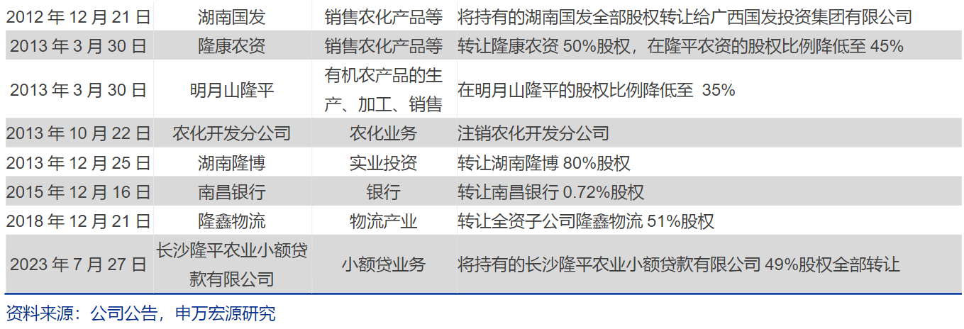 2023年7月27日,公司发布公告,转让长沙隆平农业小额贷款有限公司的全部股权,实现了金融业务的彻底剥离,进一步聚焦主业,剥离非主业资产,坚定推进“瘦身健体”工作。2012年完成了对房地产业务的彻底剥离。2012至2013年解散农化开发分公司,全面剥离了农化业务,2012年以来还陆续推进了棉花贸易、实业投资和物流等非核心业务的剥离工作,优化了资产结构。