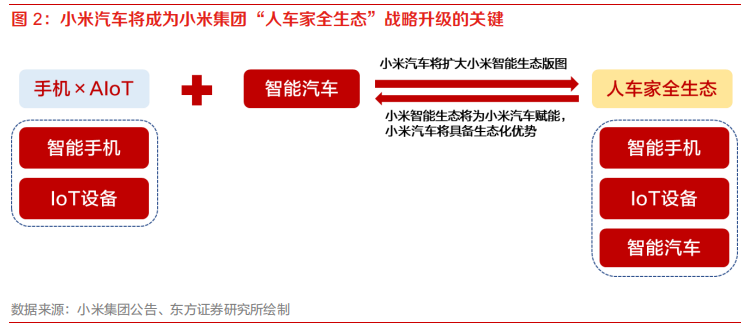 伴随“人车家全生态“战略发布,小米汽车将扩大小米智能互联生态版图。从“手机×AIoT”升级为”人-车-家“全生态有机整合,打造从个人设备、智能家居到智能出行的智能世界,小米汽车的发布将完成小米智能互联生态的闭环,为小米智能互联开启新篇章,也有望引领汽车行业向万物互联的生态化时代迈进。