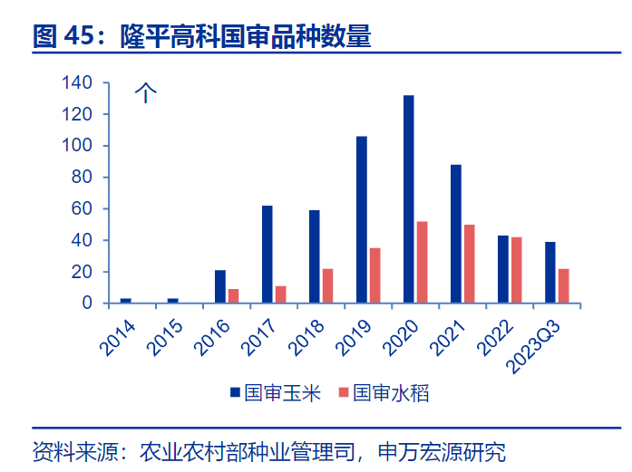 公司注重科研转化,新品种权数量快速增长,研发创新水平和科研转化效率高,2020年公司国审水稻品种达132个、国审玉米品种达52个,创历史新高。随着品种审定政策的趋严,国审品种数量逐步下降,但仍位居行业领先水平,2022年公司合计共有85个水稻及玉米品种通过国审,除了北京农科院外,隆平高科和登海种业保持行业领先,具备明显的头部优势。