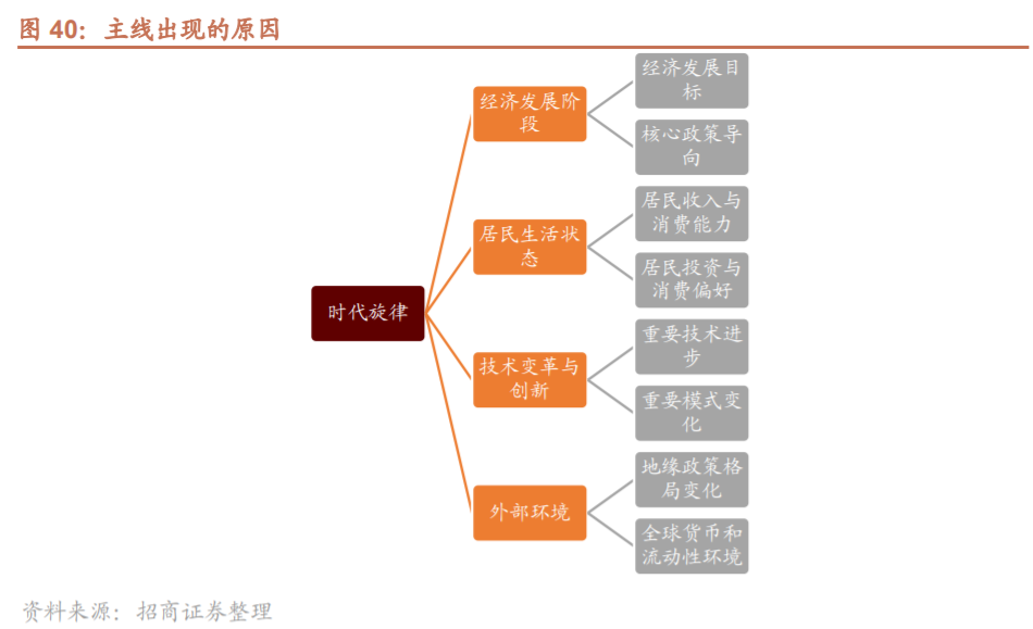 按照超额收益出现的大类行业类别,我们大致可以将过去二十年A股总结为出现了五次一级主线: